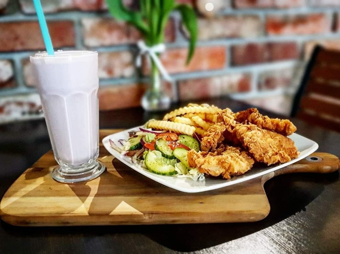 4 soczyste fileciki z kurczaka w chrupiącej panierce, surówka, frytki, sos czosnkowy -